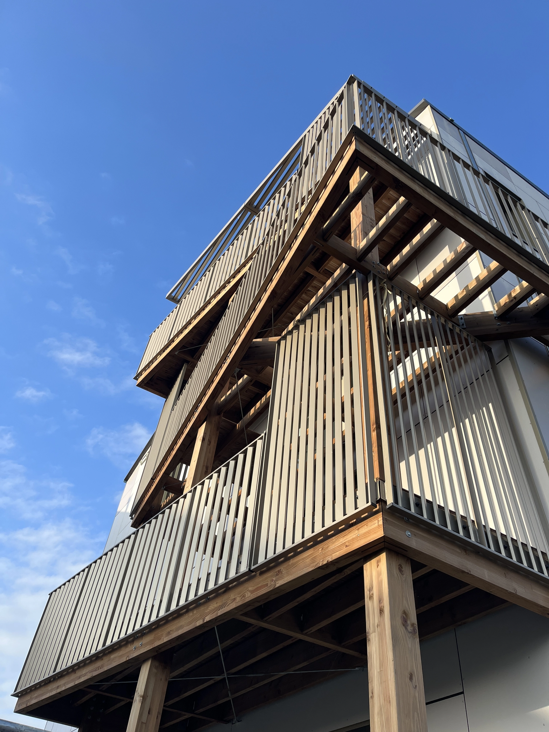 L’implantation de chaque bâtiment se fait au plus proche de la pente du terrain naturel, afin de limiter leur impact sur les écosystèmes existants. La structure du bâtiment est constituée d’une ossature mixte bois-béton, avec une isolation principalement en ouate de cellulose.