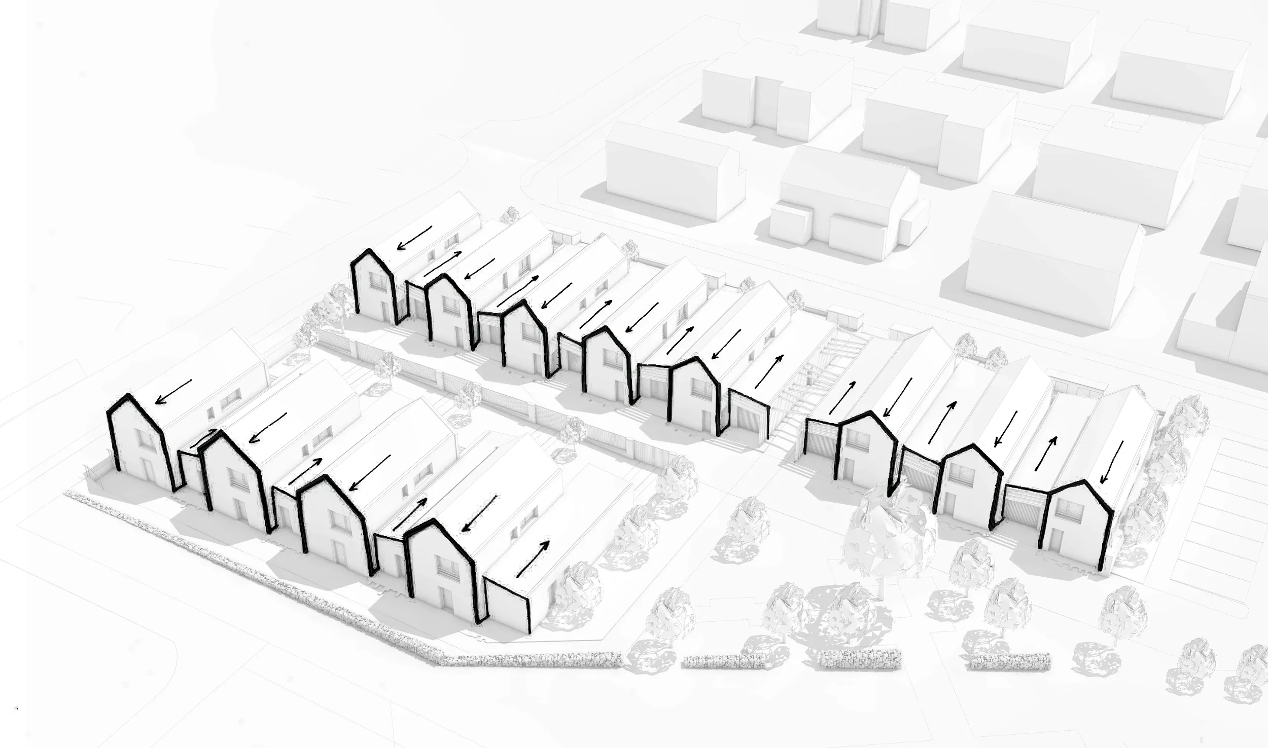 Les maisons sont décomposées en 2 volumes, le volume principal en R+1 avec une toiture à double pente et le 2nd volume en RDC en mono-pente. Les différentes hauteurs de ces volumes et leurs décalages rythment la façade et mettent à distance les habitations les unes par rapport aux autres et préservent une certaine intimité.