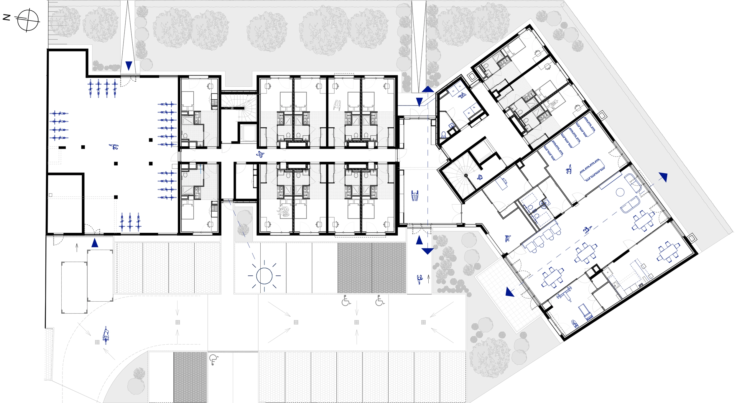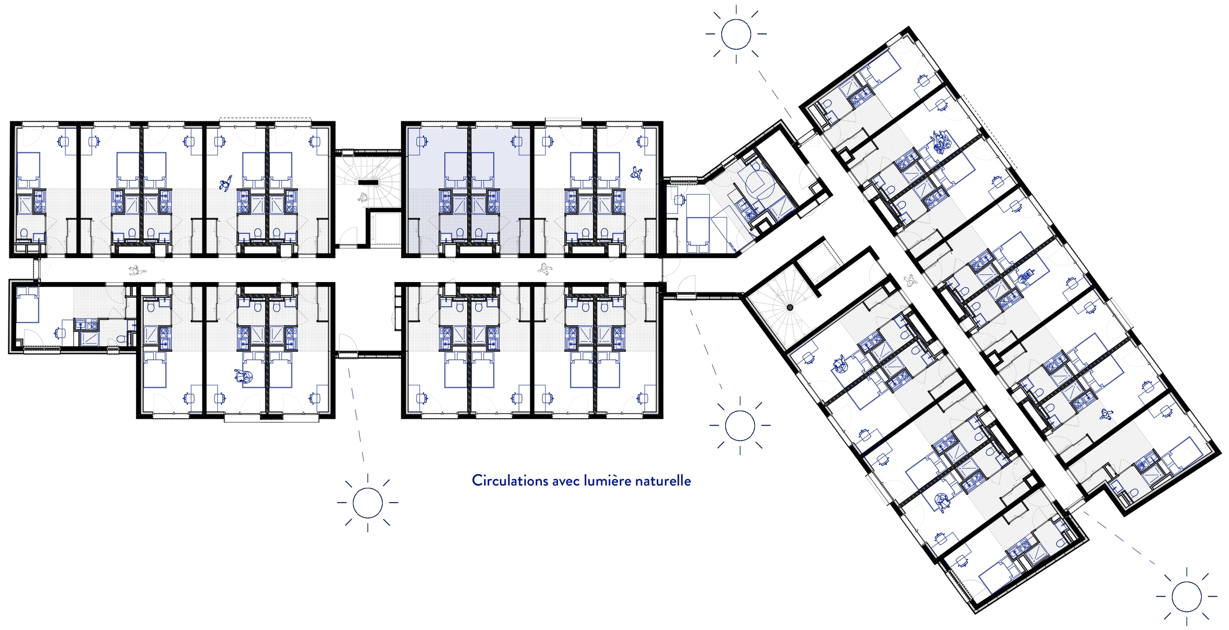 le bâtiment s’implante en limite du terrain au Nord et au Sud-est. Il dégage ainsi un vaste espace extérieur à l’Ouest du terrain, où a été prévu un parc de stationnement paysager. Un travail soigné est ainsi proposé à ce cœur d’îlot, qui permet de faire la transition entre la rue de la Croix Desilles (voie d’accès) et la résidence étudiante.