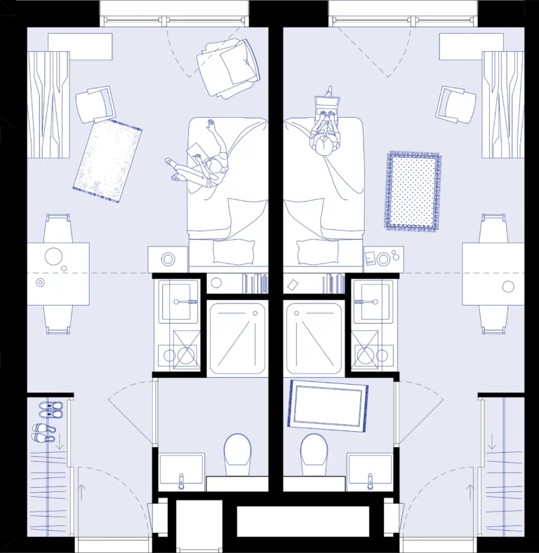 L’accès à la résidence se fait par un de ces volumes en retrait, et fait l’articulation entre les 2 parties de la construction. Ce hall, généreux, est traversant et peut être accessible depuis les espaces extérieurs communs à l’Ouest et depuis le futur chemin piéton à l’Est.
