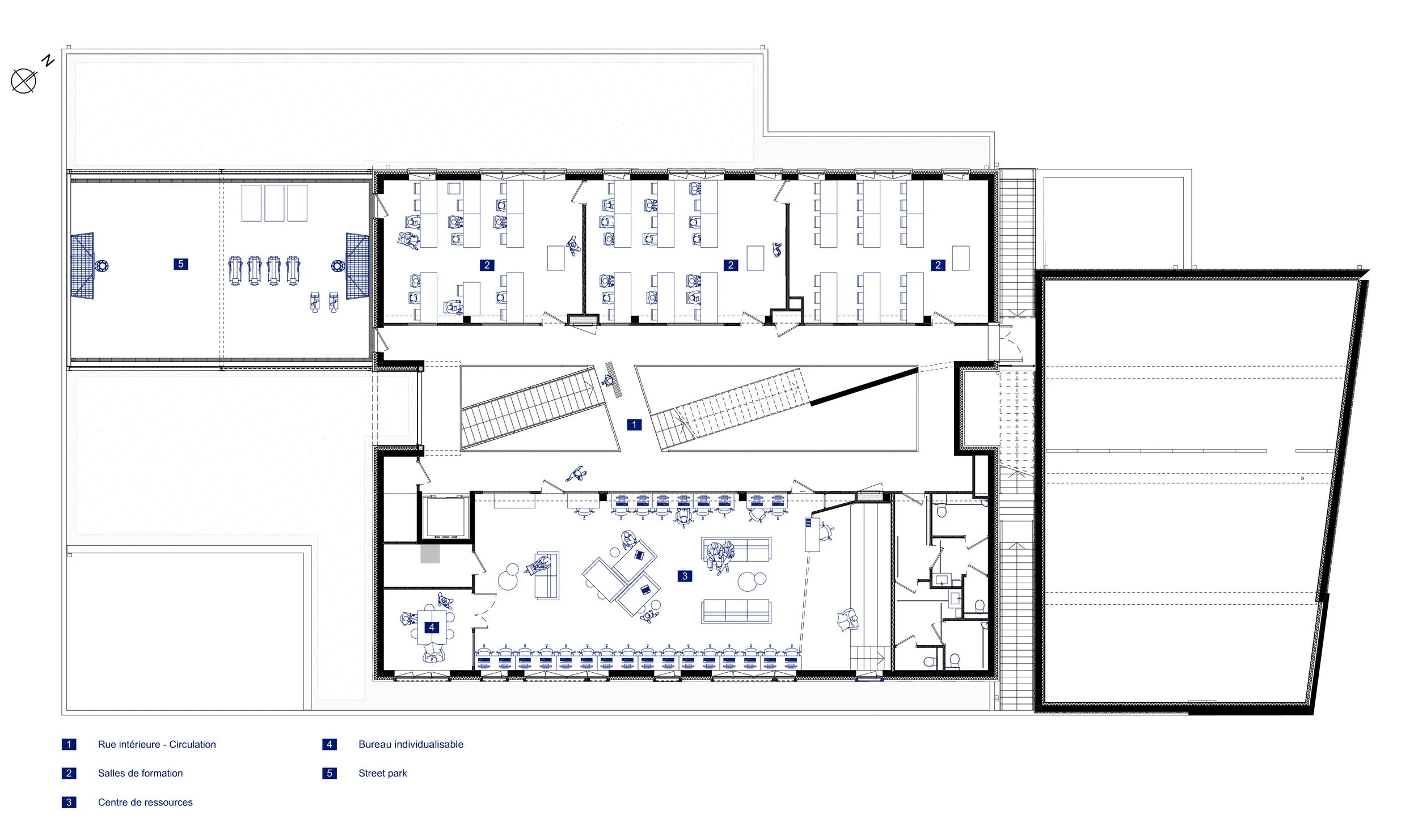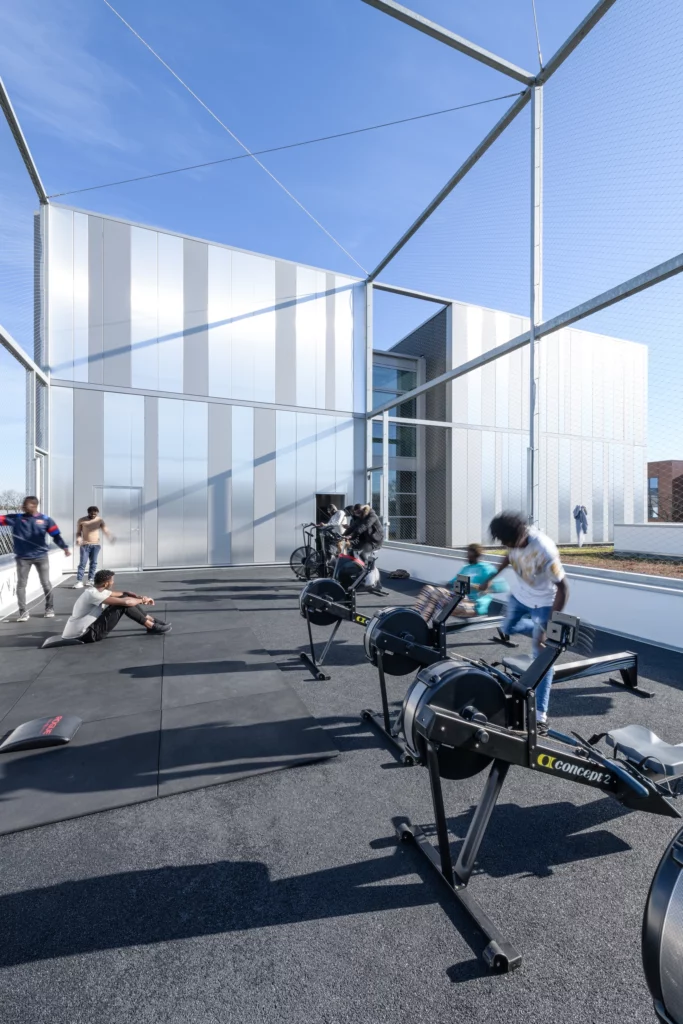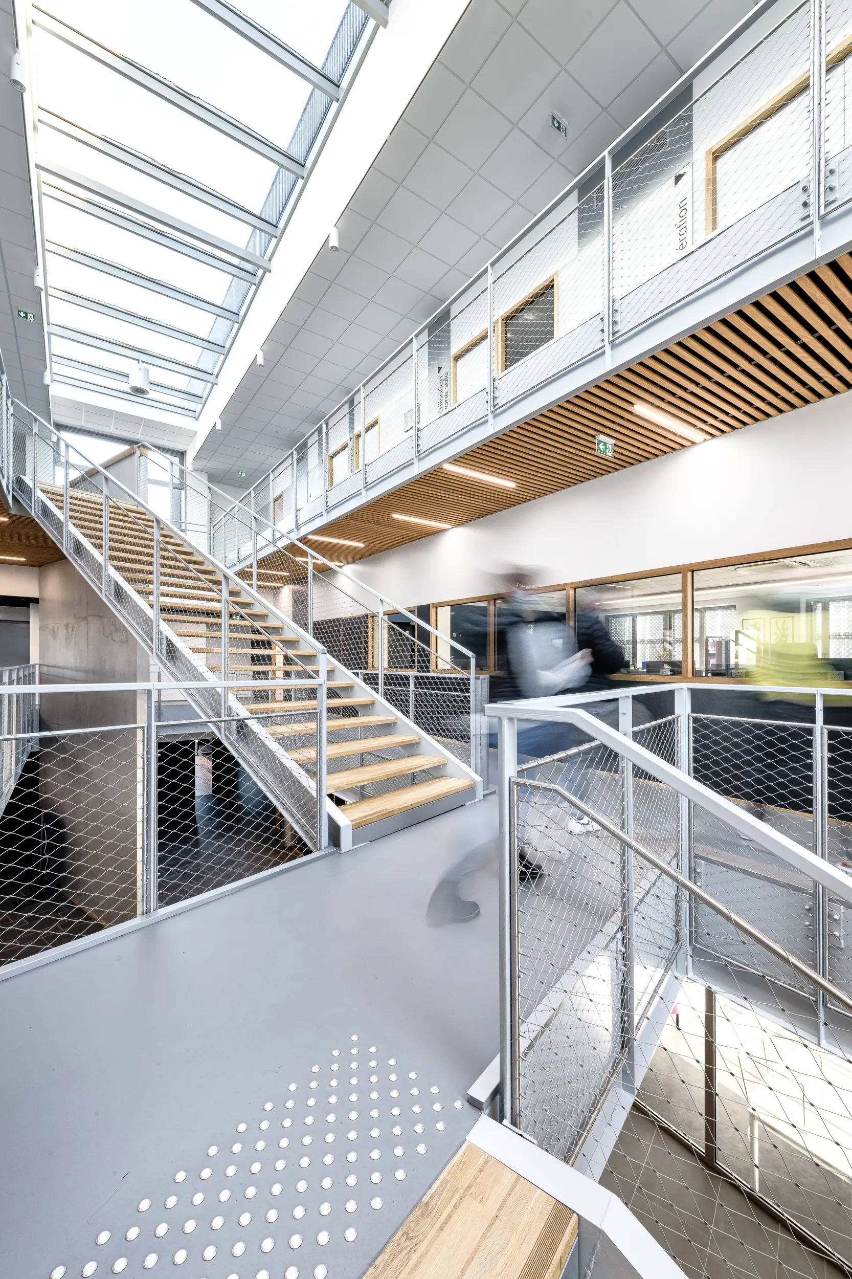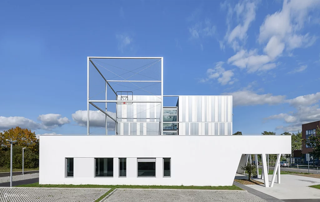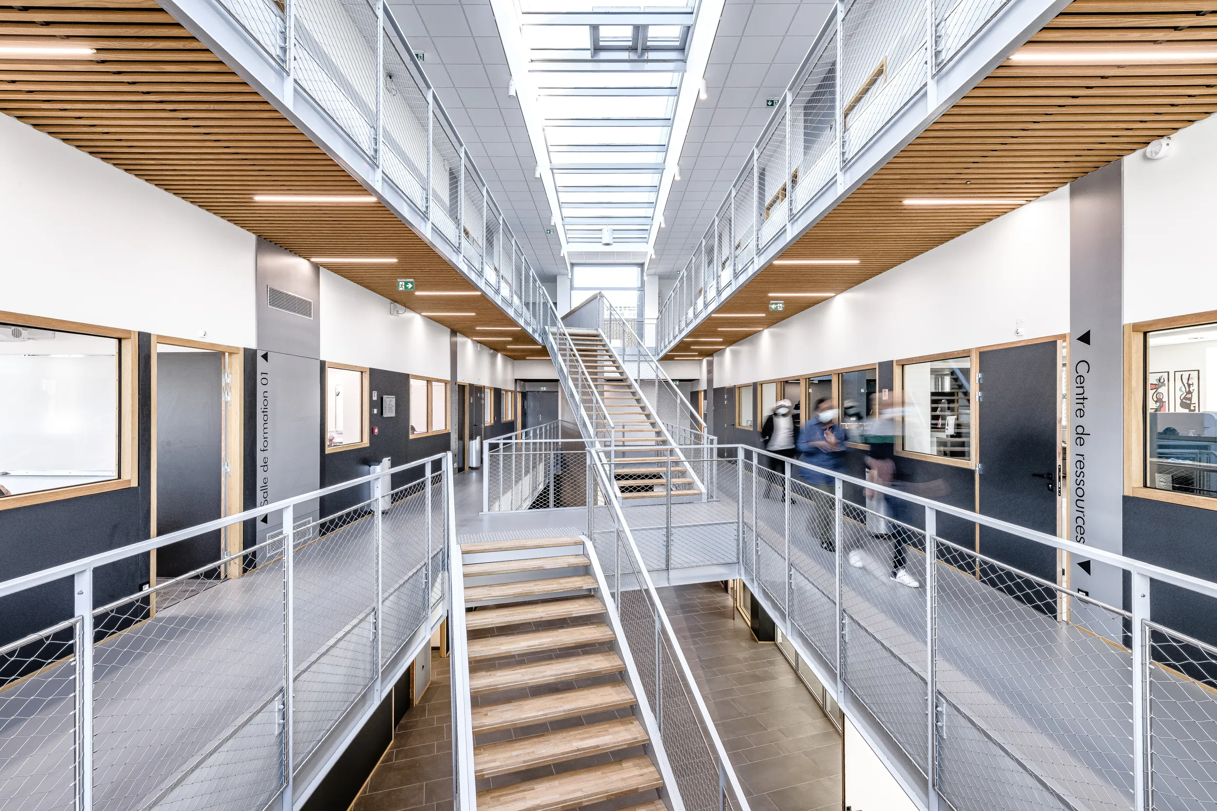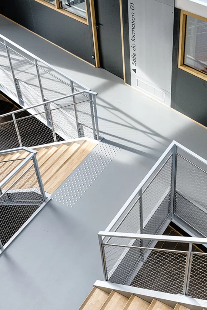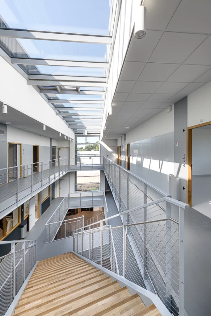 Sur un socle en béton blanc, s’installent deux niveaux destinés à l’enseignement. Les étages se divisent en deux ailes s’articulant autour d’un atrium. Celui-ci garantit un apport en lumière au centre du bâtiment et devient un véritable lieu de vie et de communication entre les espaces de formation.
