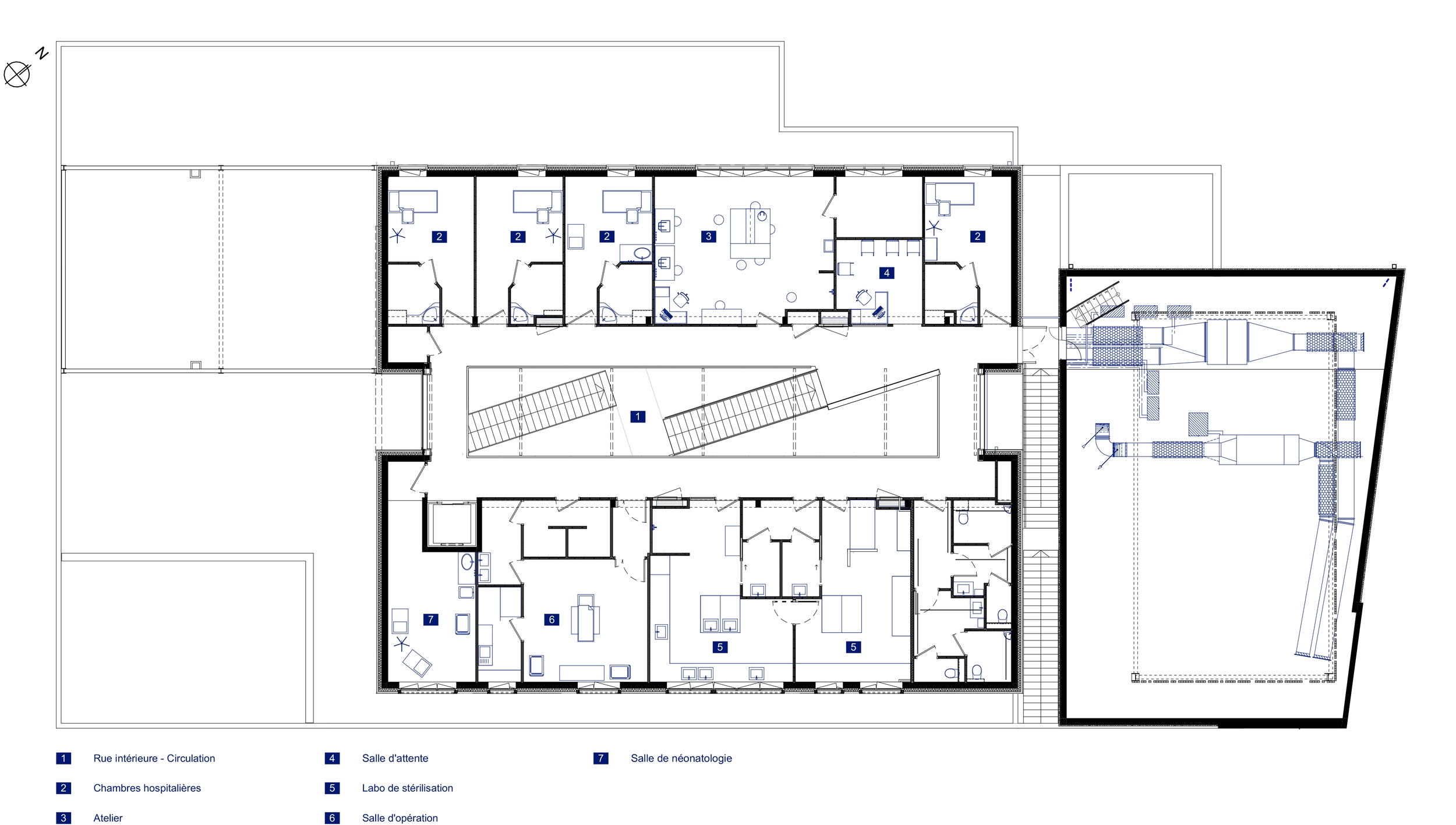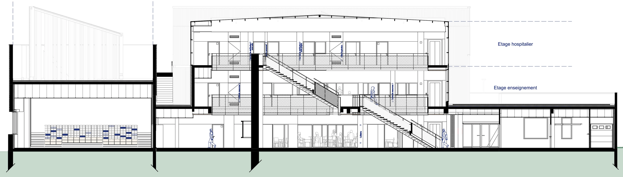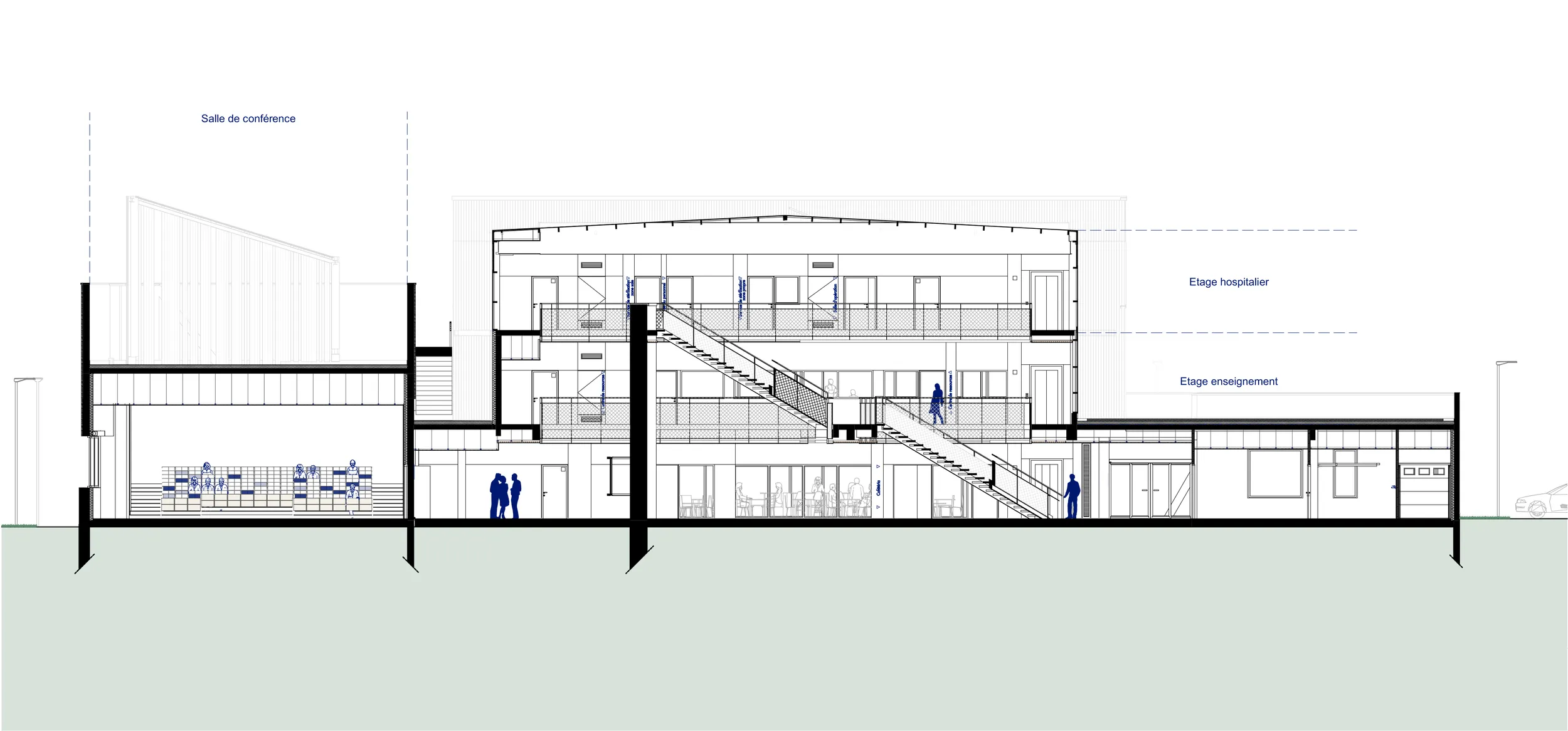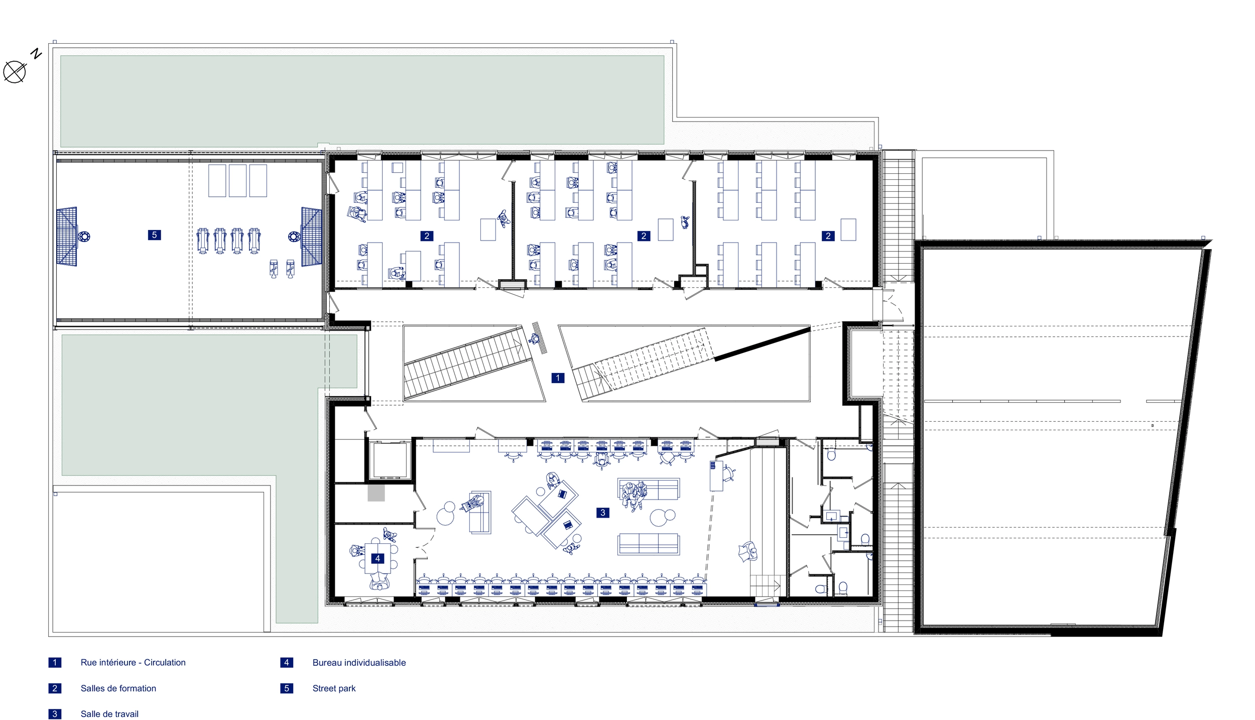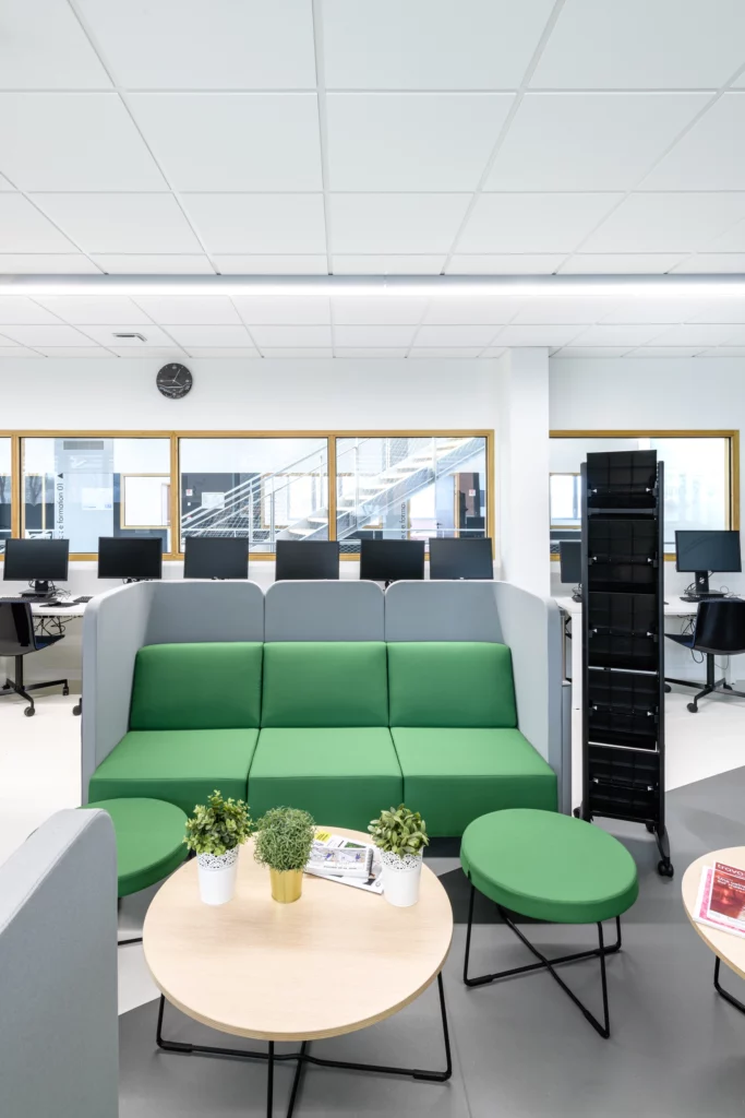 Sur un socle en béton blanc, s’installent deux niveaux destinés à l’enseignement. Les étages se divisent en deux ailes s’articulant autour d’un atrium. Celui-ci garantit un apport en lumière au centre du bâtiment et devient un véritable lieu de vie et de communication entre les espaces de formation.
