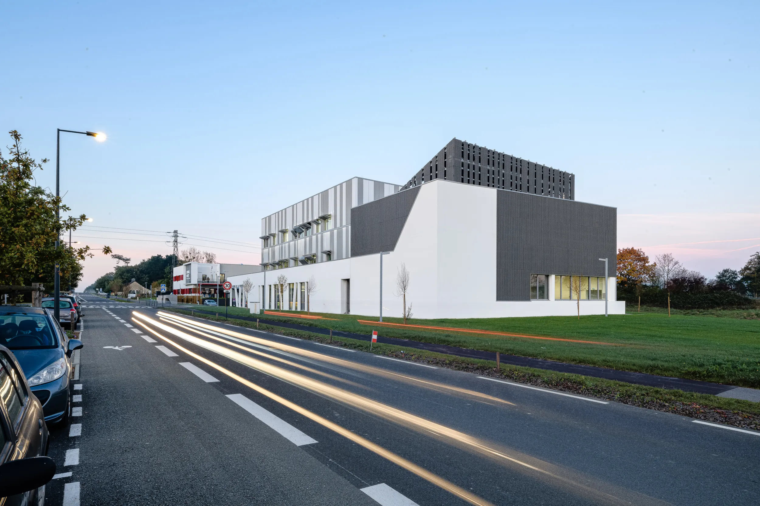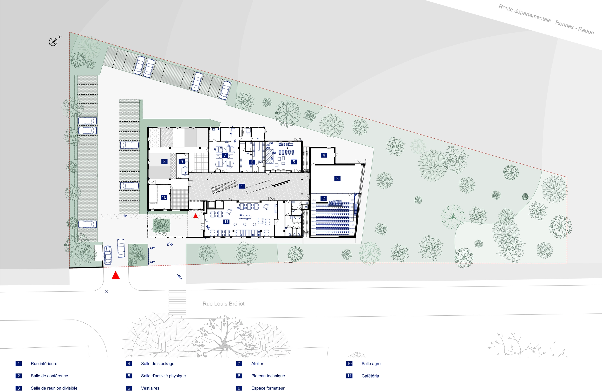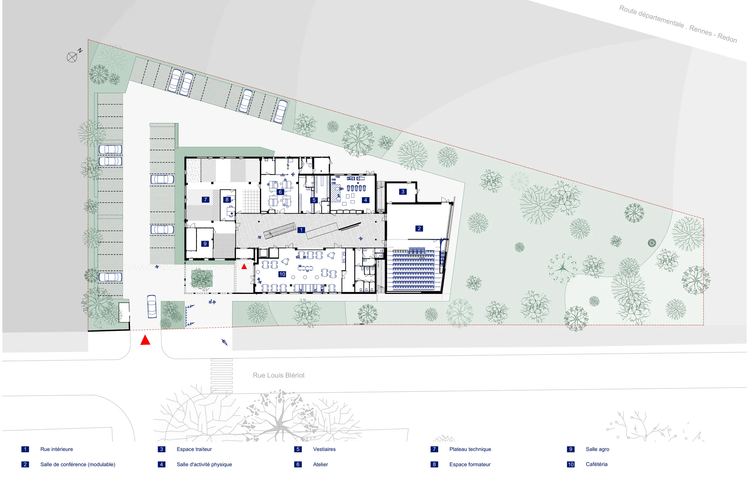 Contraintes spécifiques : insertion du projet sur une parcelle complexe de forme triangulaire et située entre la rue Louis Blériot et la voie rapide Rennes / Redon.