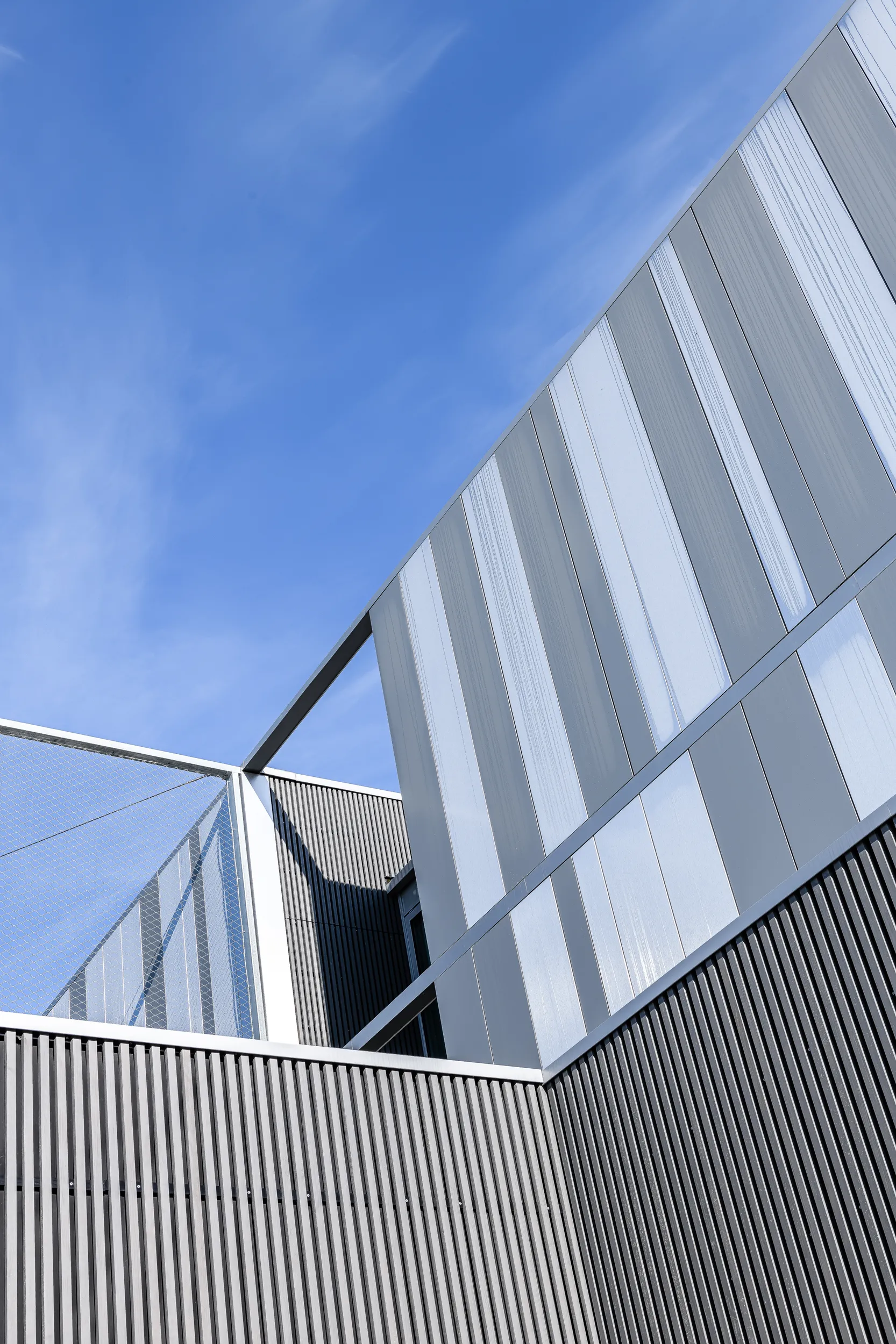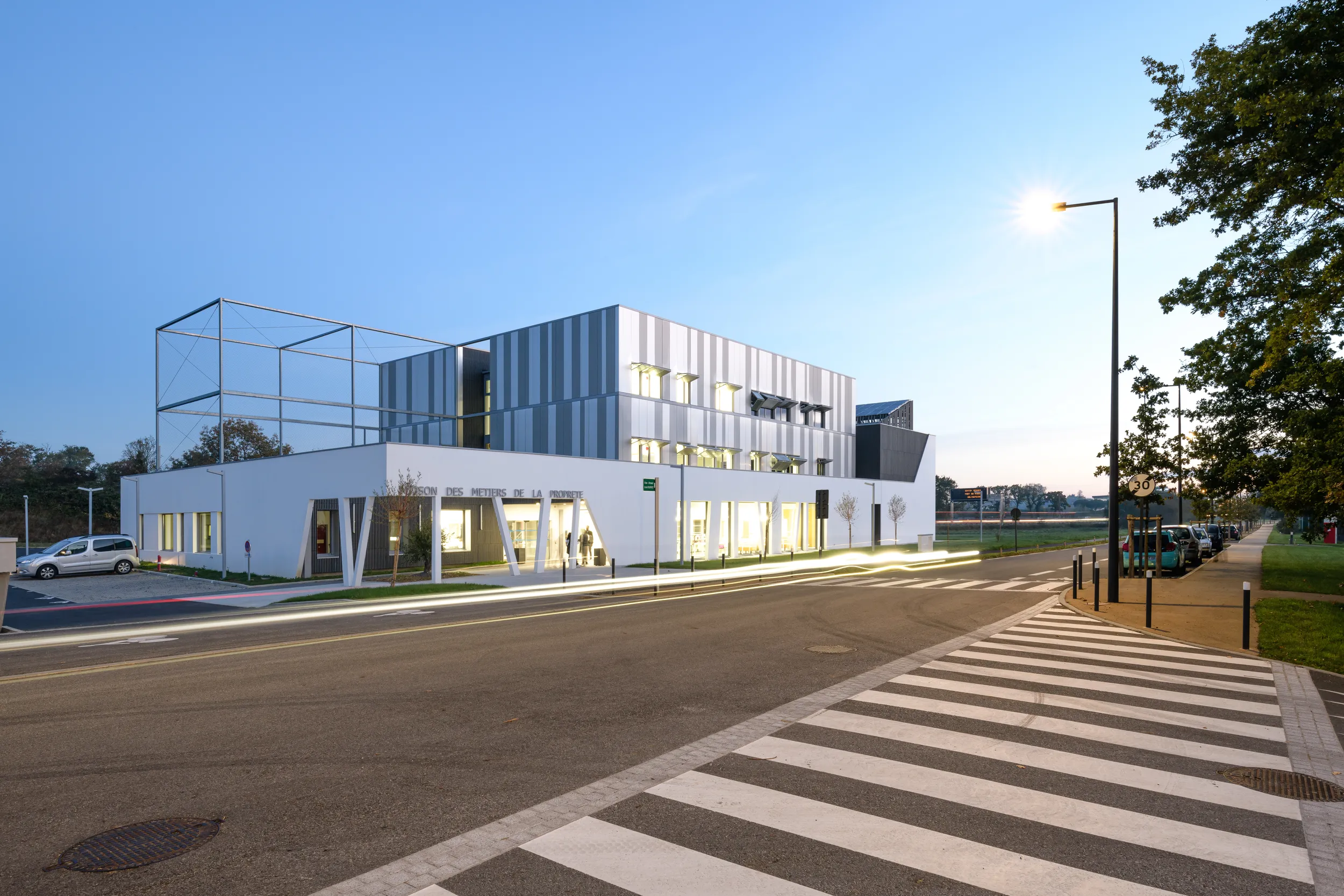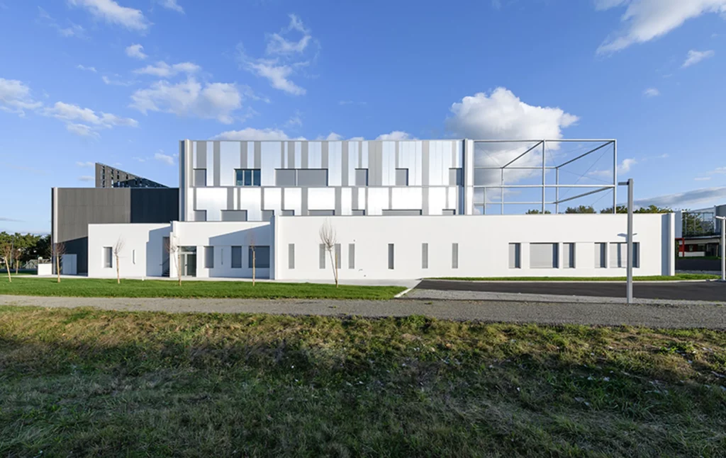Les façades des étages sont bardées de lames métalliques en deux teintes qui font vibrer le bâtiment sous la lumière du soleil. Elles intègrent également des éléments architecturaux et techniques qui participent à la qualité du bâtiment, tels que les volets papillons pour moduler les apports solaires.