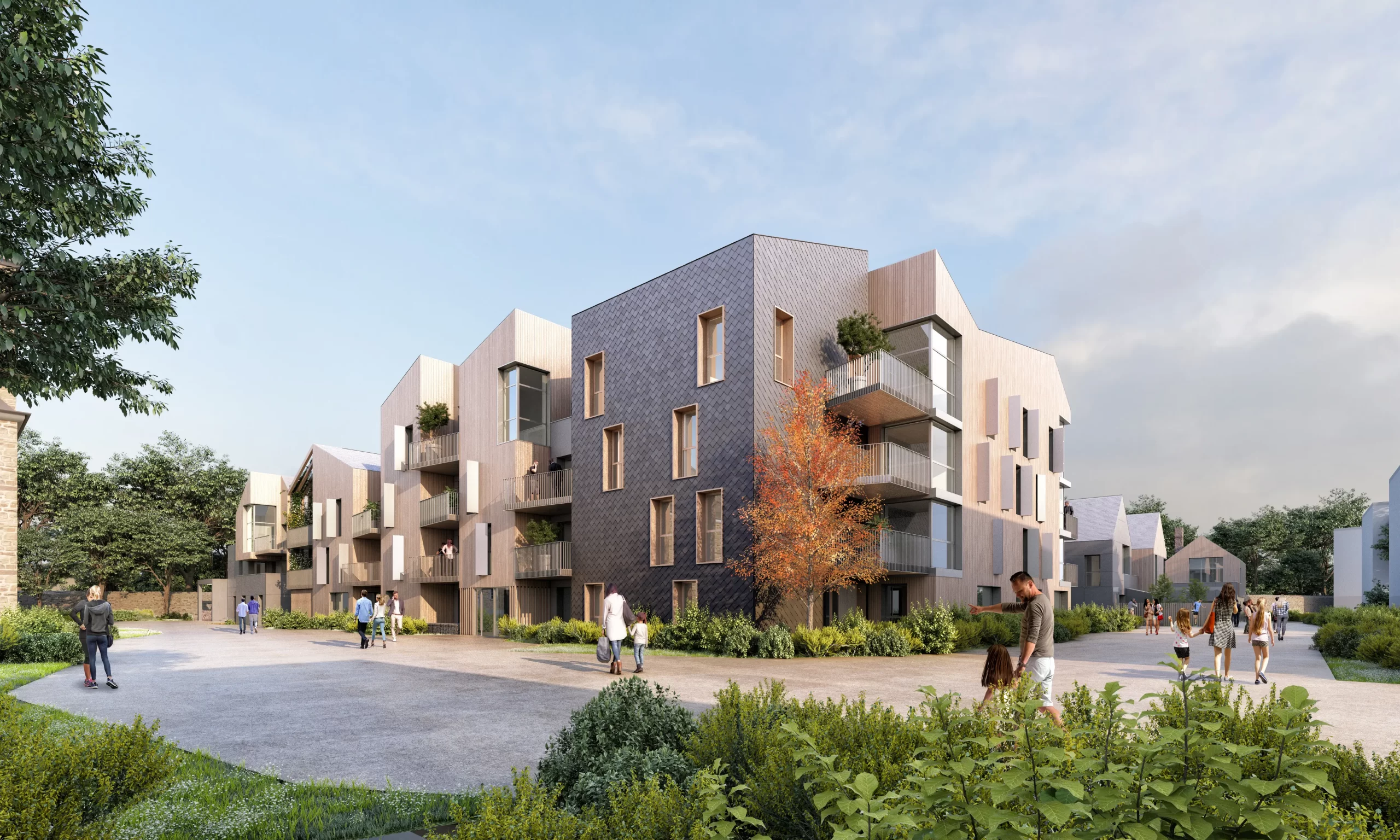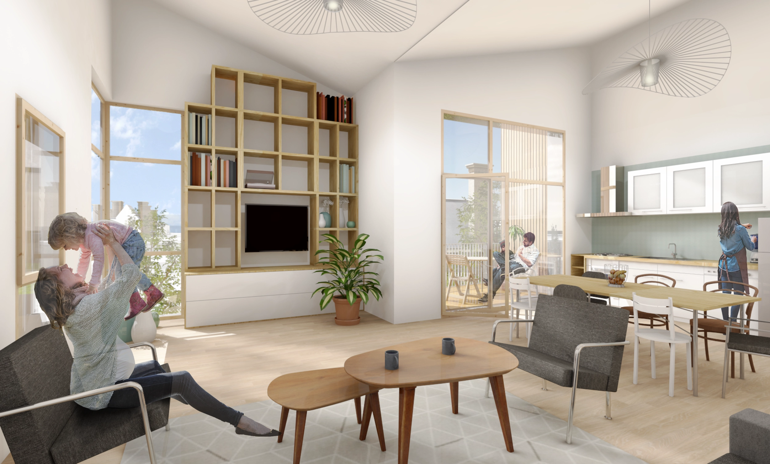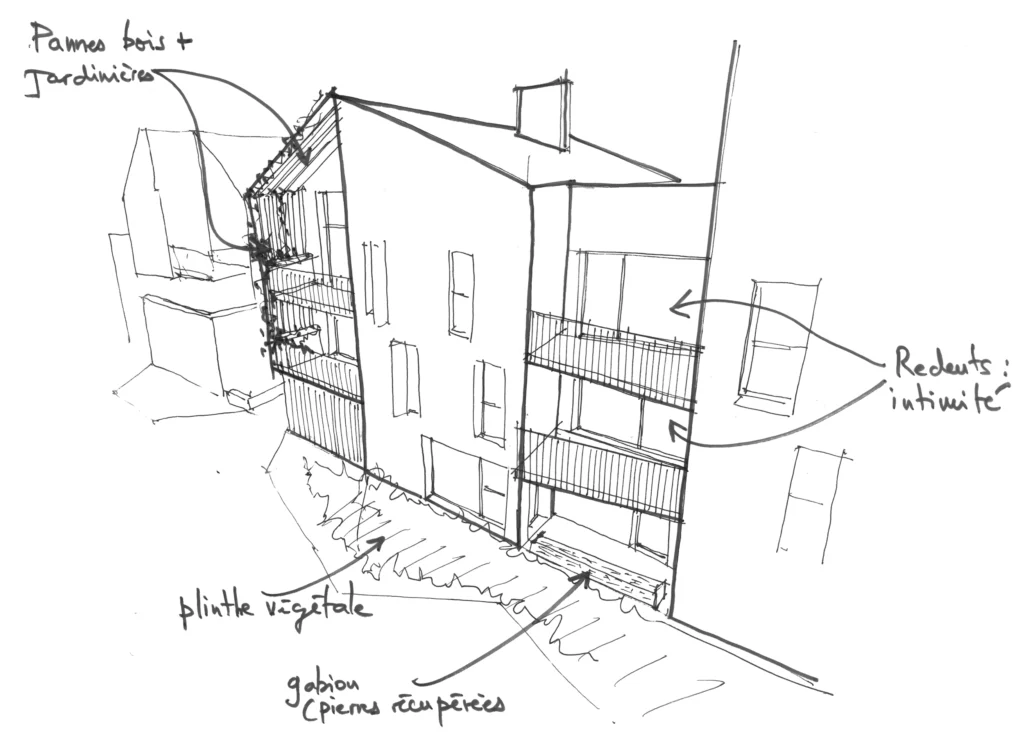 Le bâtiment de logements collectifs vient donc s’installer en limite de l’îlot, à l’alignement avec les voiries et libérer ainsi un cœur d’ilot végétalisé connecté au parc existant et permettant l’appropriation de l’espace par les habitants : le patio jardin, la place de la halle, le verger, les jeux, le bois, les jardins partagés.