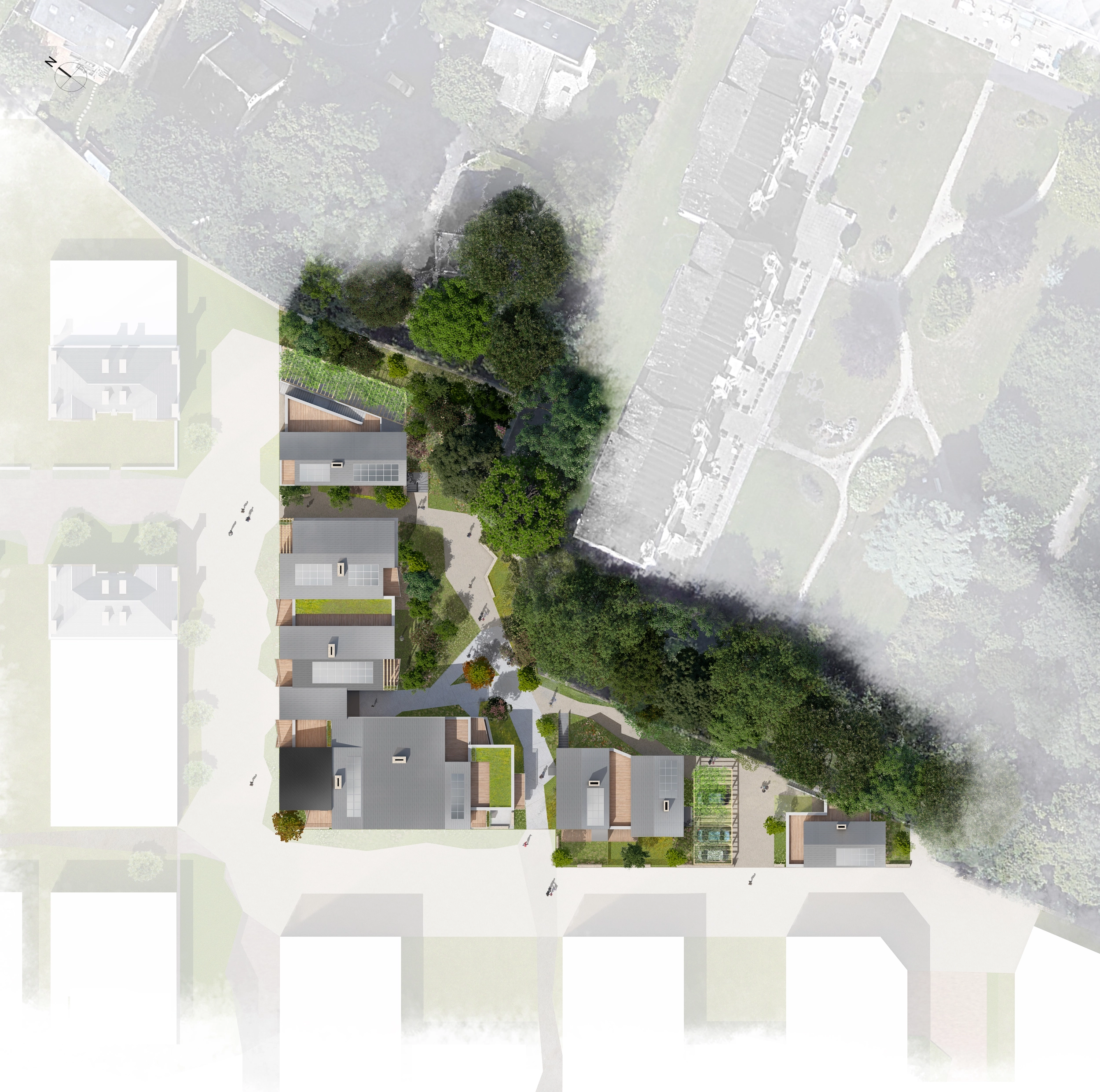 Aux deux extrémités de la parcelle, on trouvera les logements intermédiaires. Par cet épannelage, une transition douce se fait vers les maisons individuelles existantes « de l’autre côté du mur ». Il permet également de réduire fortement l’impact des ombres portées sur les jardins de ces maisons.