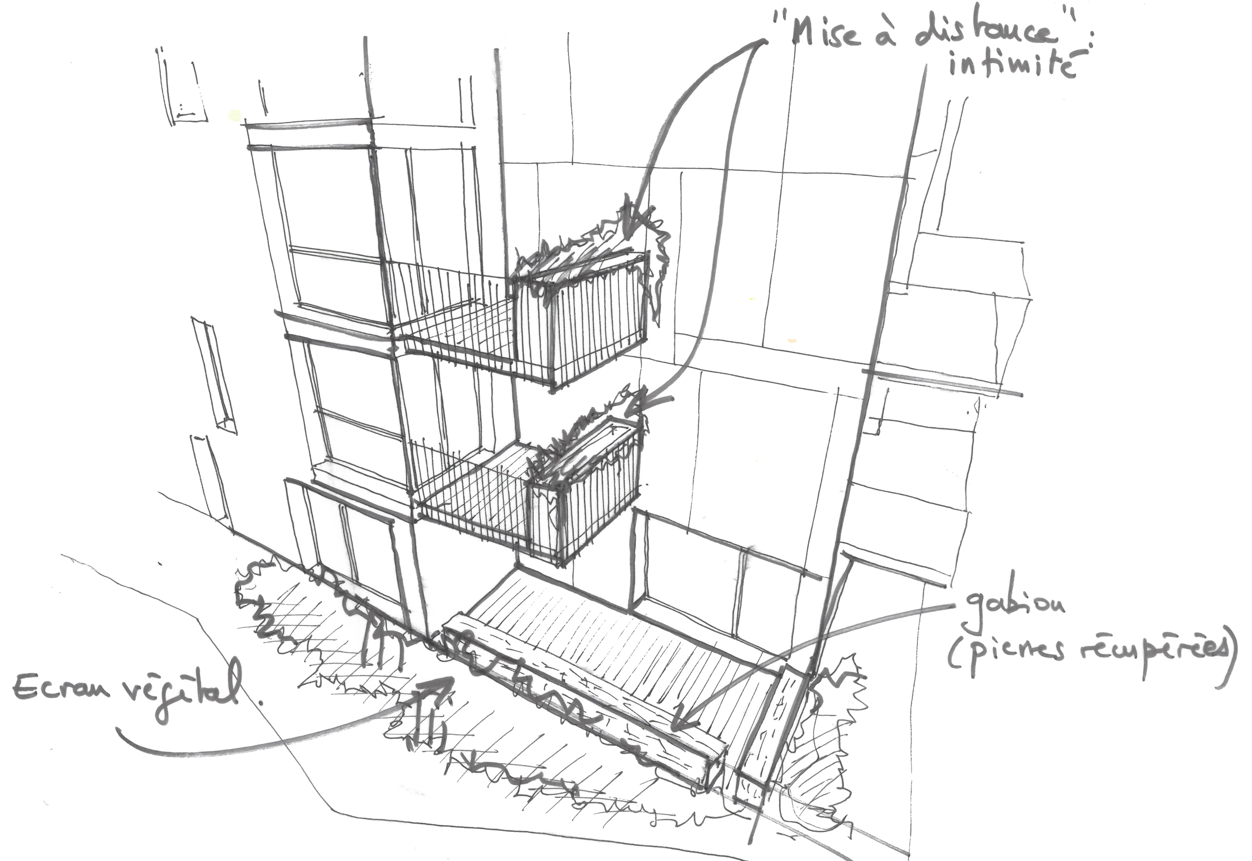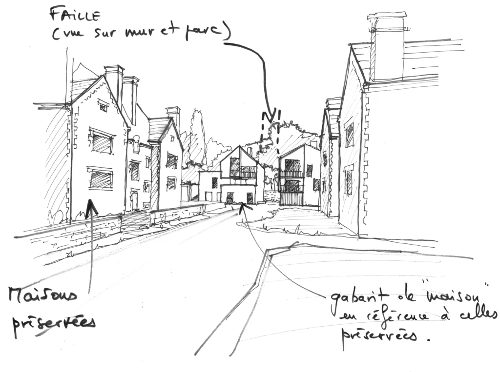 La composition est animée par 3 points forts qui permettent un jeu de perspectives enrichissant le projet. D’une part un volume vient marquer l’angle de la composition. C’est un repère fort dans le paysage en accentuant la verticalité par un revêtement de façade unique par son coloris et sa matérialité et par son ancrage dans le sol. D’autre part, un volume proche de la maison individuelle (intermédiaire) permet de créer un effet de profondeur, en arrêtant le regard et en le recentrant sur le cœur d’îlot. Enfin, nous proposons une faille permettant une perspective depuis une des voies principales sur le cœur d’îlot et le mur d’enceinte. Cette perspective est accentuée par la vue sur la végétation importante située derrière le mur dans le parc des Néréides.